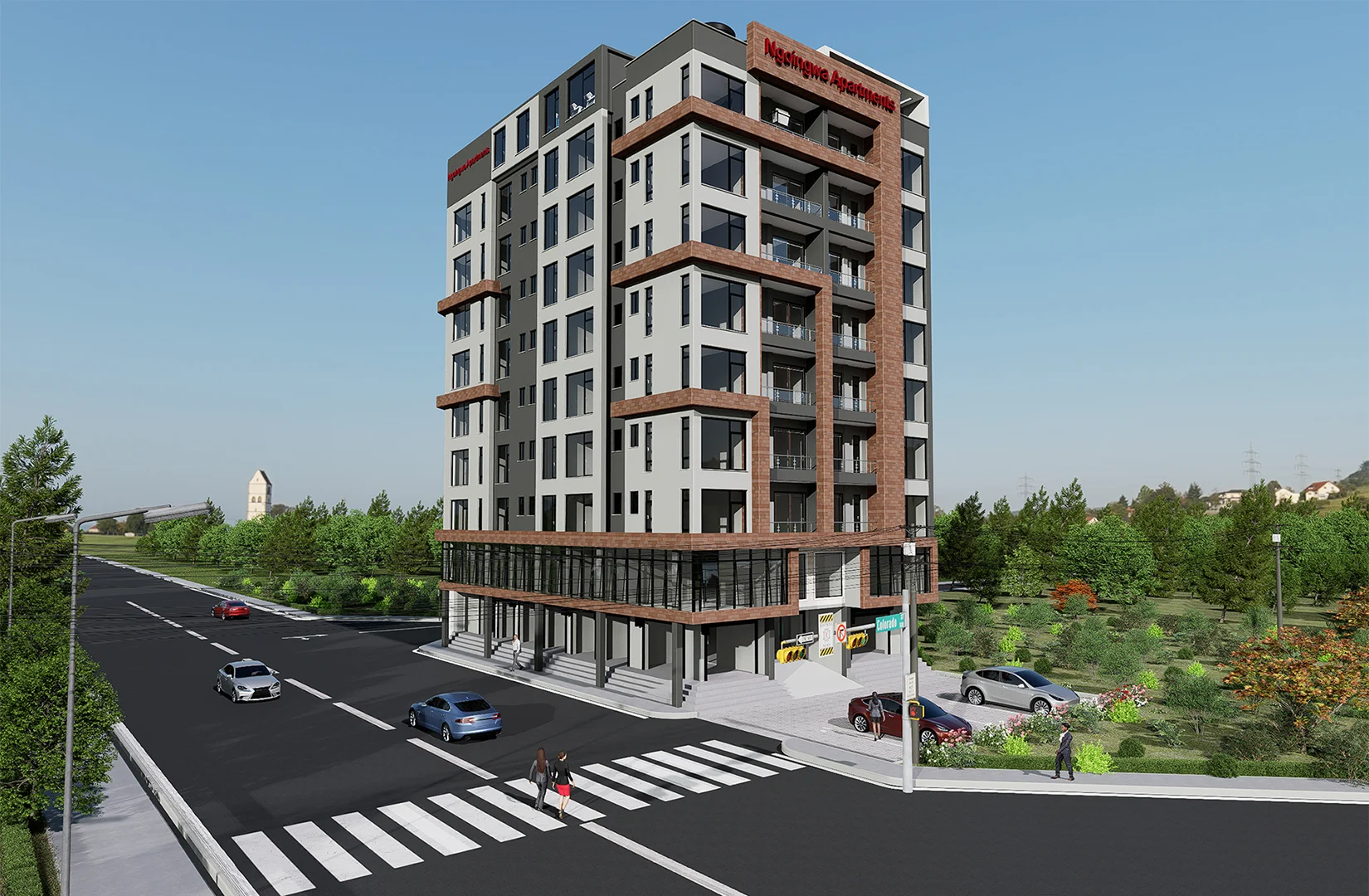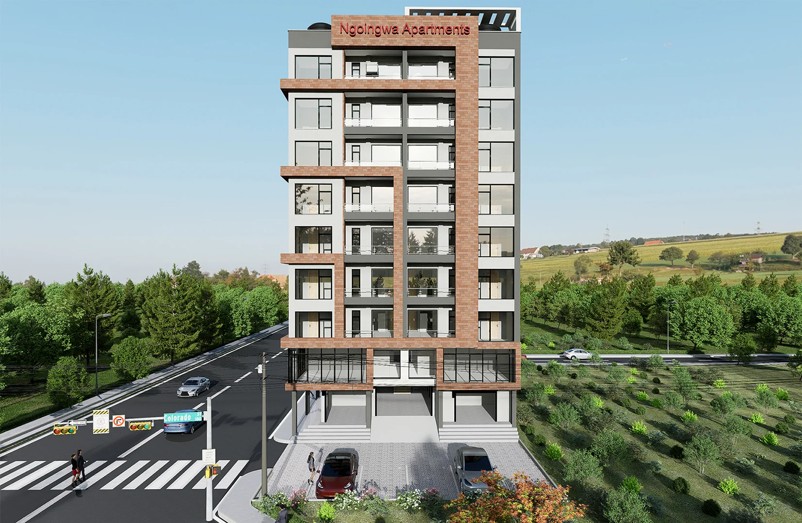 This 9-storey development offers 42 residential units; with one and two-bedroom, as well as studio configurations. Located on a strategic corner plot along the bustling Mang’u-Thika road, it features road frontages on three sides, maximizing visibility and accessibility. Consisting of commercial spaces on the ground and mezzanine floors, providing a dynamic mix of residential and business uses. Ample basement parking ensures secure parking, while separate access and elevator provide privacy for residents. With a rooftop entertainment area and a gym, it is designed to meet the needs of both residents and businesses in a vibrant urban setting.
